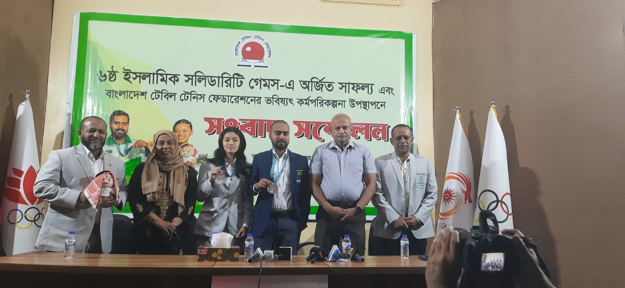 ইসলামিক সলিডারিটি গেমসে বাংলাদেশ টেবিল টেনিস মিশ্র বিভাগে রৌপ্য পদক পেয়েছে। খৈ খৈ মারমা ও জাভেদ আহমেদকে নিয়ে আজ দুপুরে বাংলাদেশ অলিম্পিক এসোসিয়েশনে এক সংবাদ সম্মেলন করে টেবিল টেনিস ফেডারেশন। সেখানে দুই পদক জয়ী খেলোয়াড় সাফল্যের গল্প, সম্ভাবনা ও চাহিদার কথা জানিয়েছেন। পাশাপাশি ফেডারেশনের সাধারণ সম্পাদক মাকসুদ আহমেদ সনেটও পরিকল্পনা ও সংকটের চিত্র তুলে ধরেছেন।
